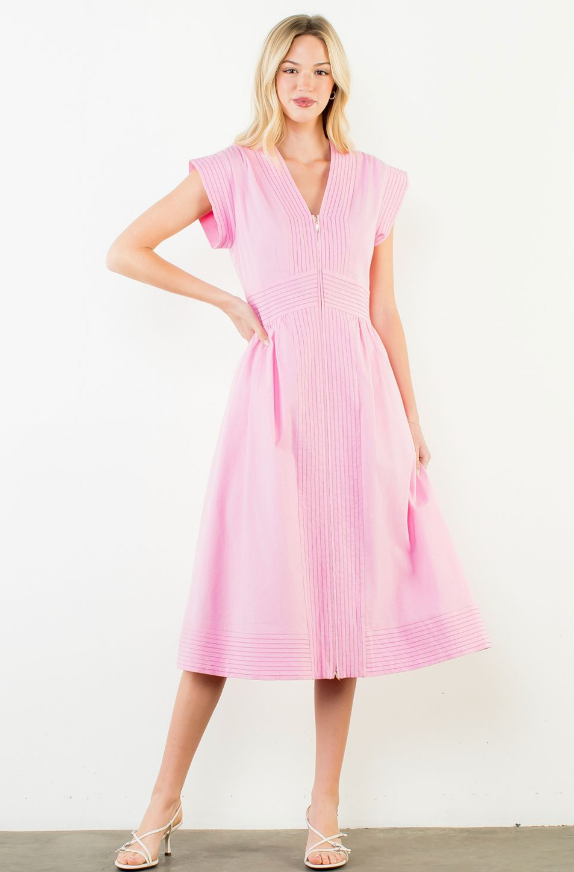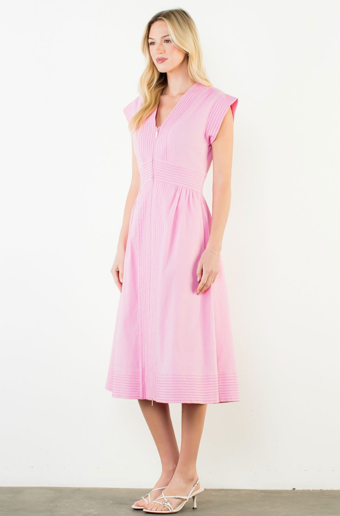 Elevate your everyday wardrobe with the Ballet Bloom Dress, a sophisticated short-sleeve midi that combines timeless elegance with modern versatility. The delicate pintuck detailing adds refined texture and visual interest, while the convenient zip closure ensures effortless dressing. Perfect for transitioning from office to evening, this polished piece flatters with its midi length and structured silhouette. Whether you're heading to brunch or a special occasion, this dress delivers understated luxury that works as hard as you do.