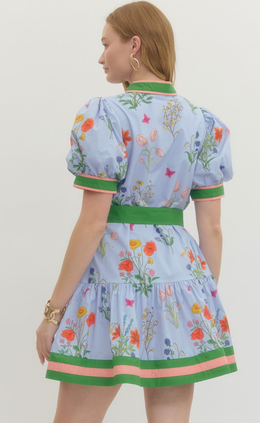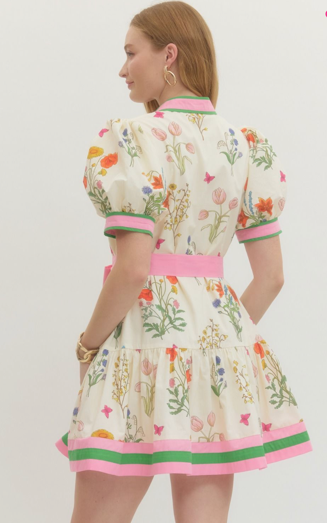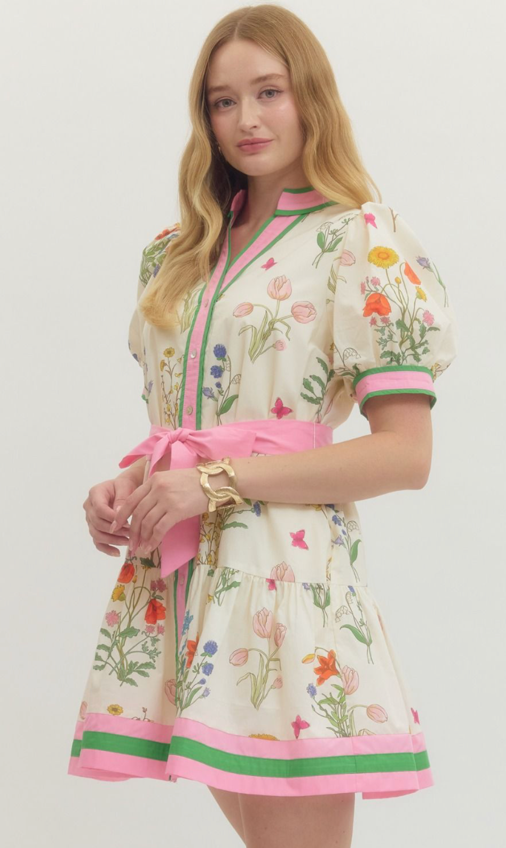 Bloom into effortless style with the Buttoned Blossom Dress, a charming mini featuring a vibrant floral print that turns heads. The puffed sleeves add romantic flair while contrast trim details elevate the look. Slip on with ease thanks to the front button closure and adjustable self-tie waist belt that lets you customize your fit. Practical side pockets keep essentials within reach, while the lined, non-sheer woven fabric ensures comfort and confidence all day long. Lightweight and beautifully constructed, this dress transitions seamlessly from casual outings to weekend adventures.