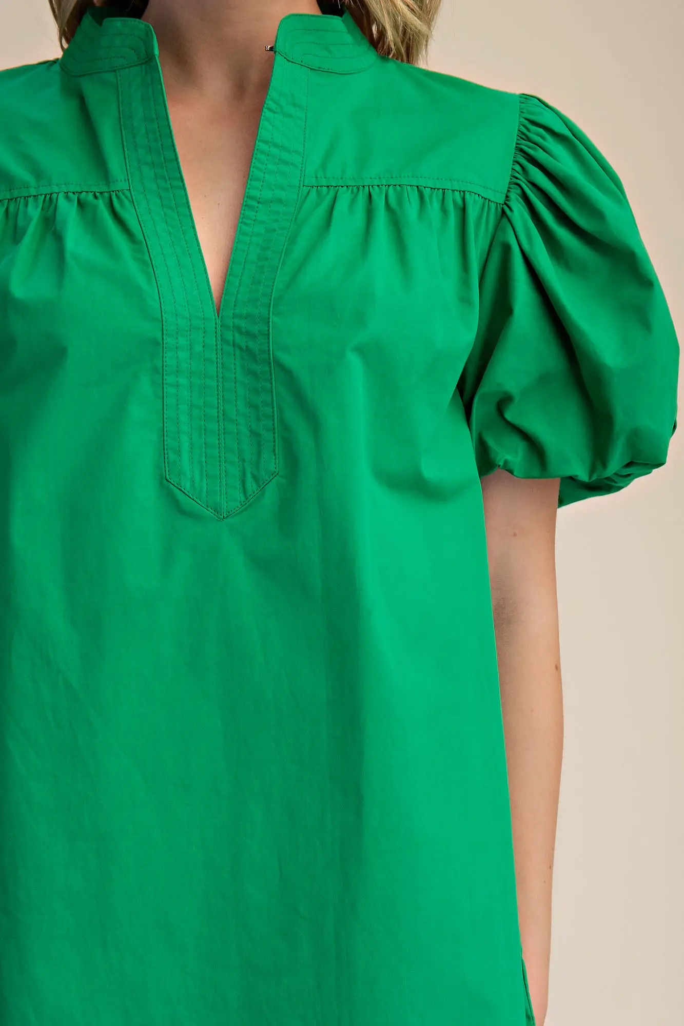 Turn heads in this captivating Heirloom Honey Dress, where vintage-inspired design meets modern sophistication. The elegant V-neckline flatters every frame, while voluminous bubble sleeves add a touch of whimsy and movement. Crafted in a lush green shade that complements all skin tones, this mini dress features a structured china collar for polished refinement. Whether you're attending a cocktail party, weekend getaway, or special celebration, this dress delivers the perfect balance of comfort and glamour. Make a statement with a piece that feels as luxurious as it looks—because you deserve to feel absolutely stunning.