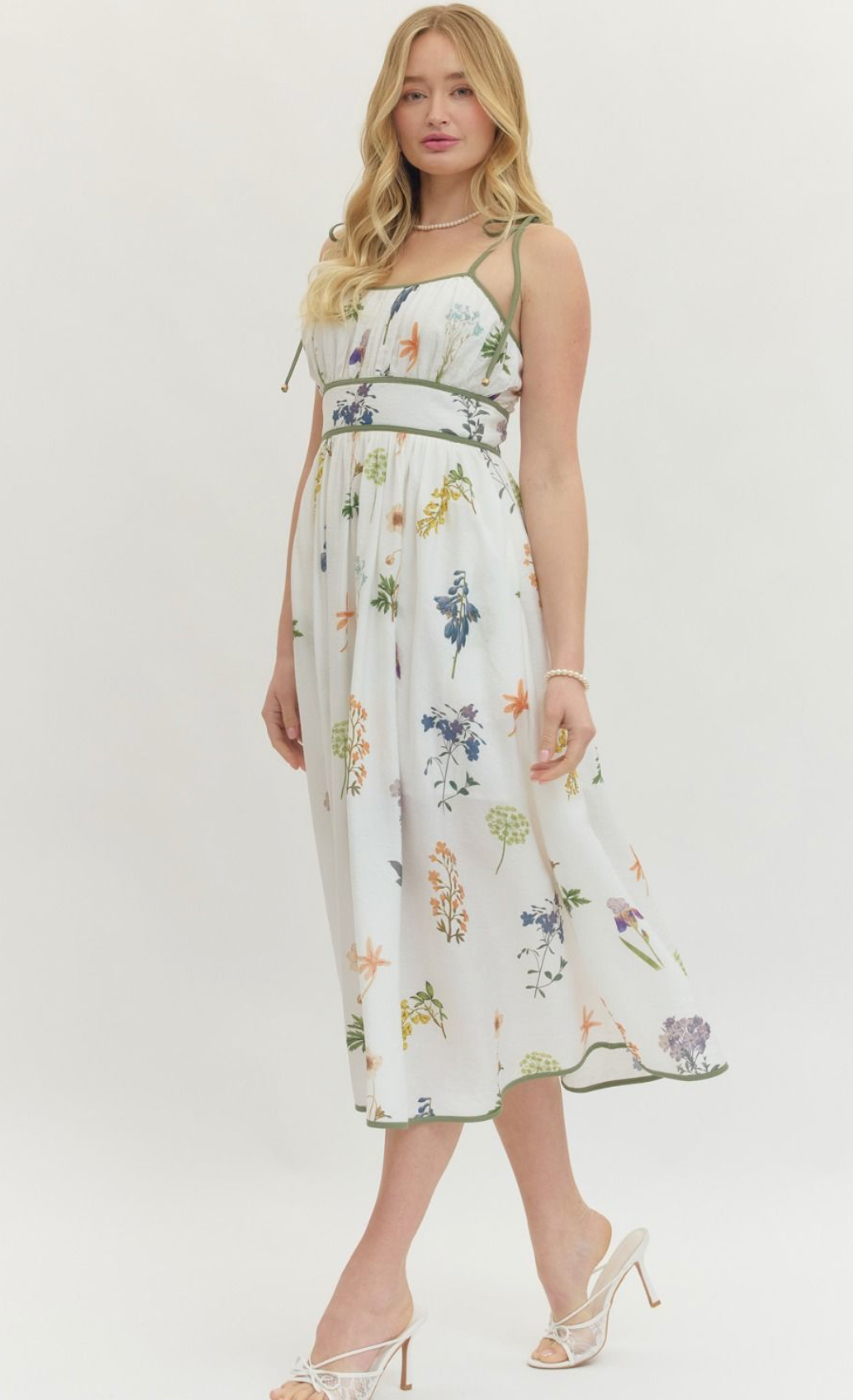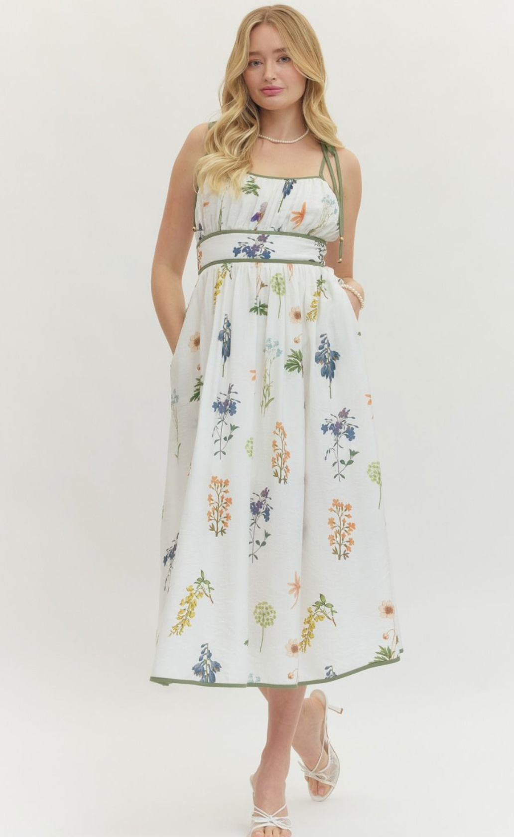 Embrace effortless elegance with this ivory wildflower dress, designed to flatter and move with you. The empire waist with contrast binding creates a refined silhouette, while adjustable shoulder tie straps offer a customizable fit. Smocked elastic at the back provides comfort and subtle shaping. A convenient zipper closure and functional side pockets add practicality to this lightweight, woven piece. Fully lined and non-sheer, this sleeveless midi dress transitions seamlessly from day to evening, making it an essential addition to any wardrobe.