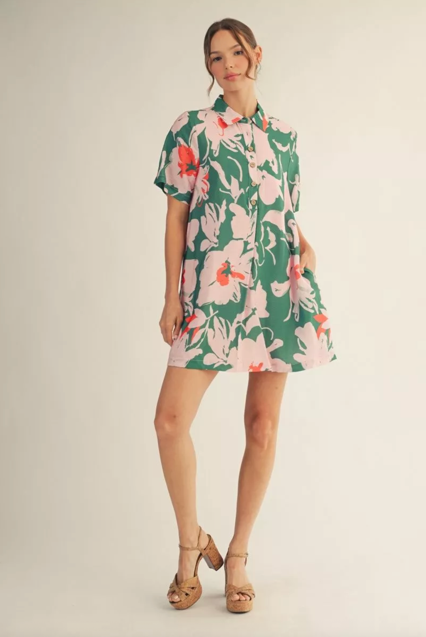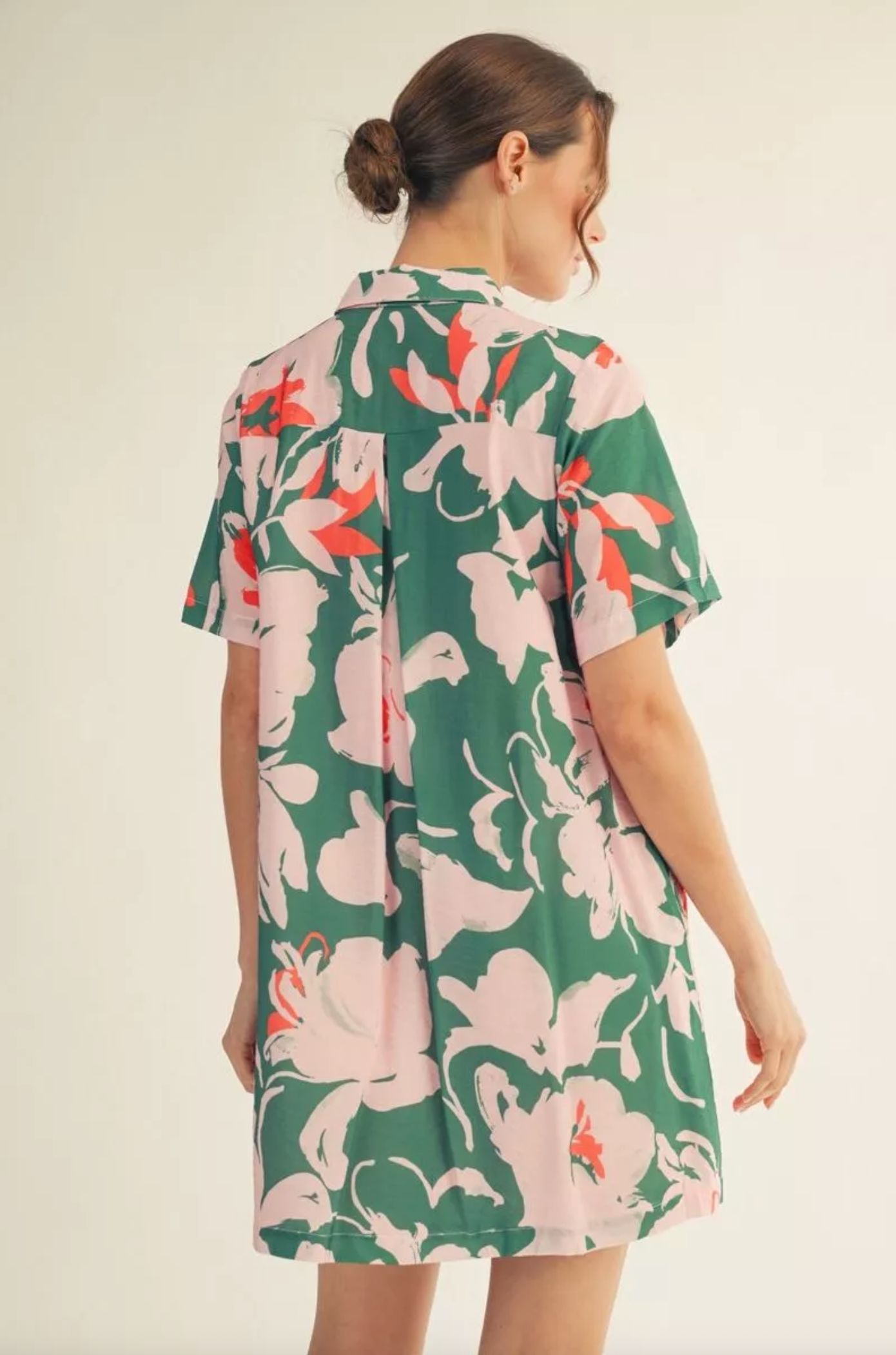 Escape to paradise with the Jade Palm Dress, a breezy button-up shirt dress that effortlessly transitions from day to night. Featuring vibrant tropical florals and flattering pleated detailing, this piece combines style with practicality—functional side pockets keep your essentials close while short sleeves keep you cool. Perfect for warm weather adventures, casual outings, or resort getaways, this versatile dress delivers resort-ready elegance without the fuss.
