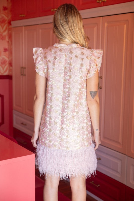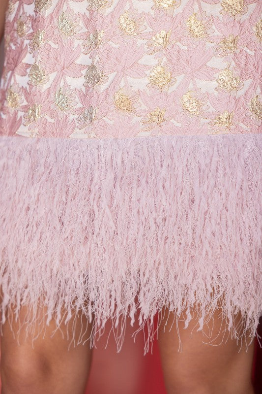 Turn heads at your next event in this stunning pink floral jacquard mini dress. The luxe metallic brocade fabric shimmers with every movement, while the V-neckline and charming cap ruffle sleeves add feminine elegance. An eye-catching ostrich feather hem creates an unforgettable finishing touch that sets this dress apart. The relaxed shift silhouette flatters every figure, making it the perfect choice for cocktail parties, weddings, and special occasions. Dress it up with heels and statement jewelry for an instantly sophisticated look that commands attention.