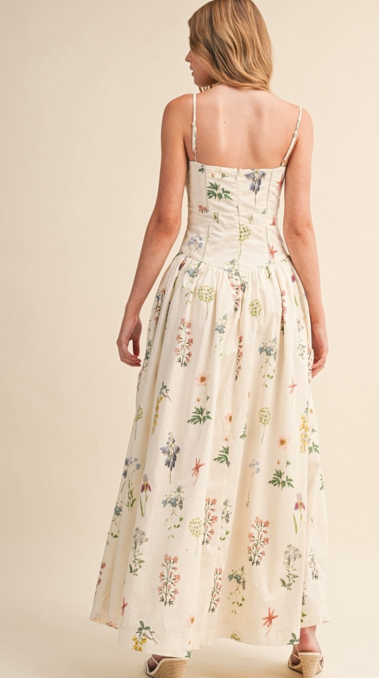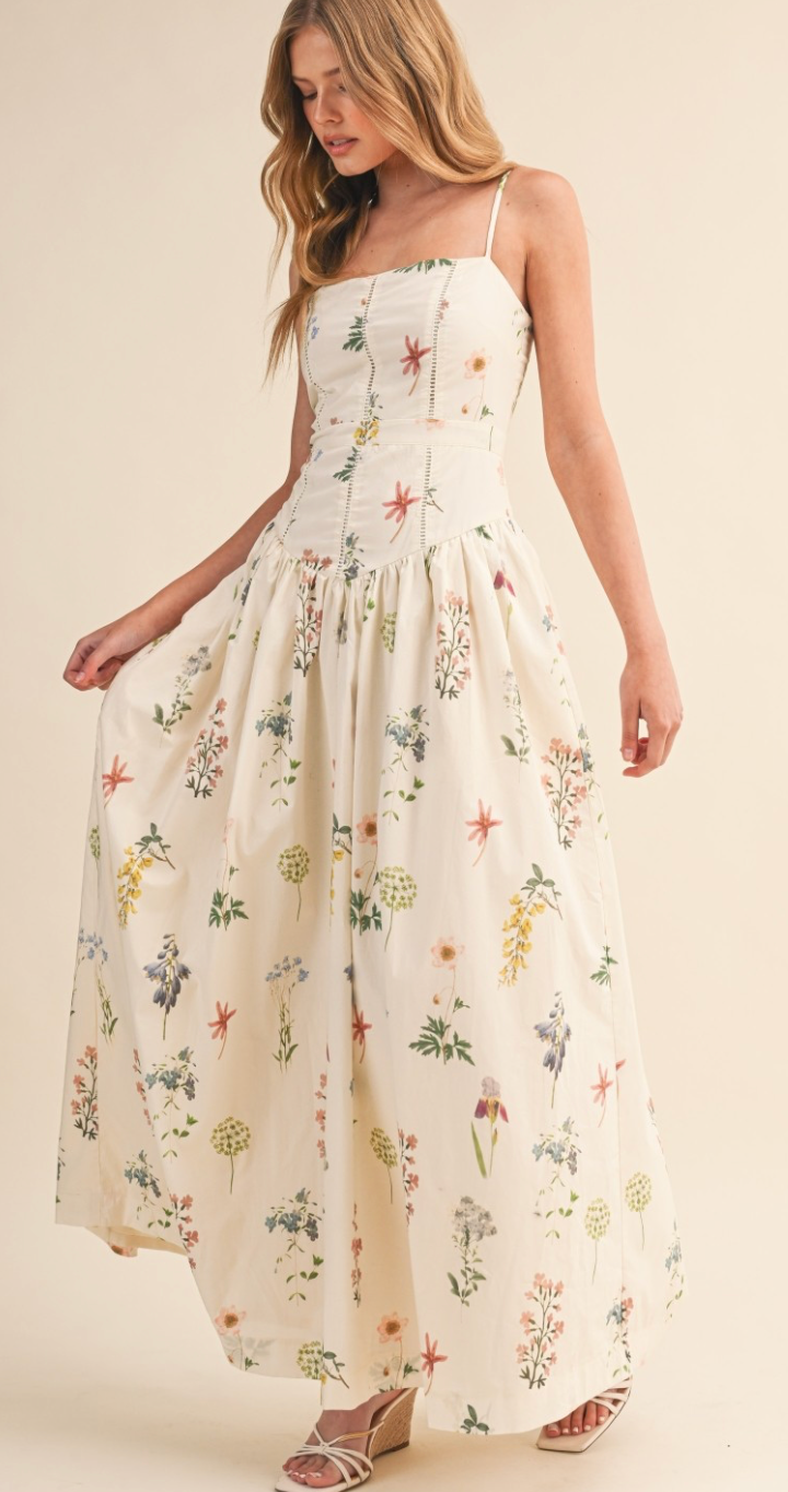 Escape into elegance with the Secret Garden Silhouette Dress, where romantic florals meet effortless sophistication. This stunning maxi features delicate adjustable cami straps and a fitted bodice that flatters your figure, while the graceful drop waist and flowing skirt create movement with every step. Crafted from lightweight woven fabric, it's your go-to piece for garden parties, brunch dates, and special occasions. True to size with a relaxed skirt and fitted bodice—the perfect balance of comfort and style.