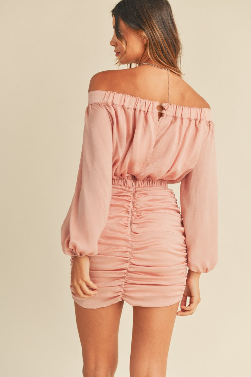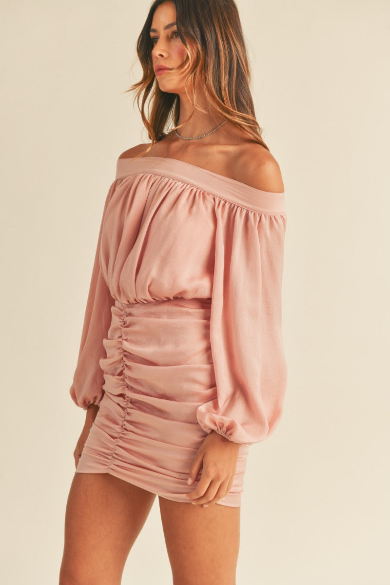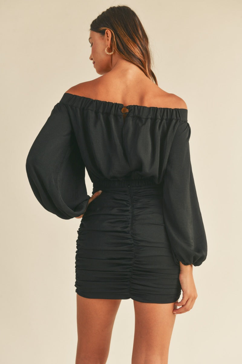 Elevate your evening with the Soirée Enchanté Dress, featuring an off-the-shoulder neckline and billowy long sleeves for a graceful allure. The ruched skirt cinches your waist, highlighting your curves with a romantic silhouette. Crafted from stretchy fabric, it offers both comfort and style, ideal for any special occasion or upscale dinner. Complete your look with strappy heels and statement earrings to make a lasting impression.