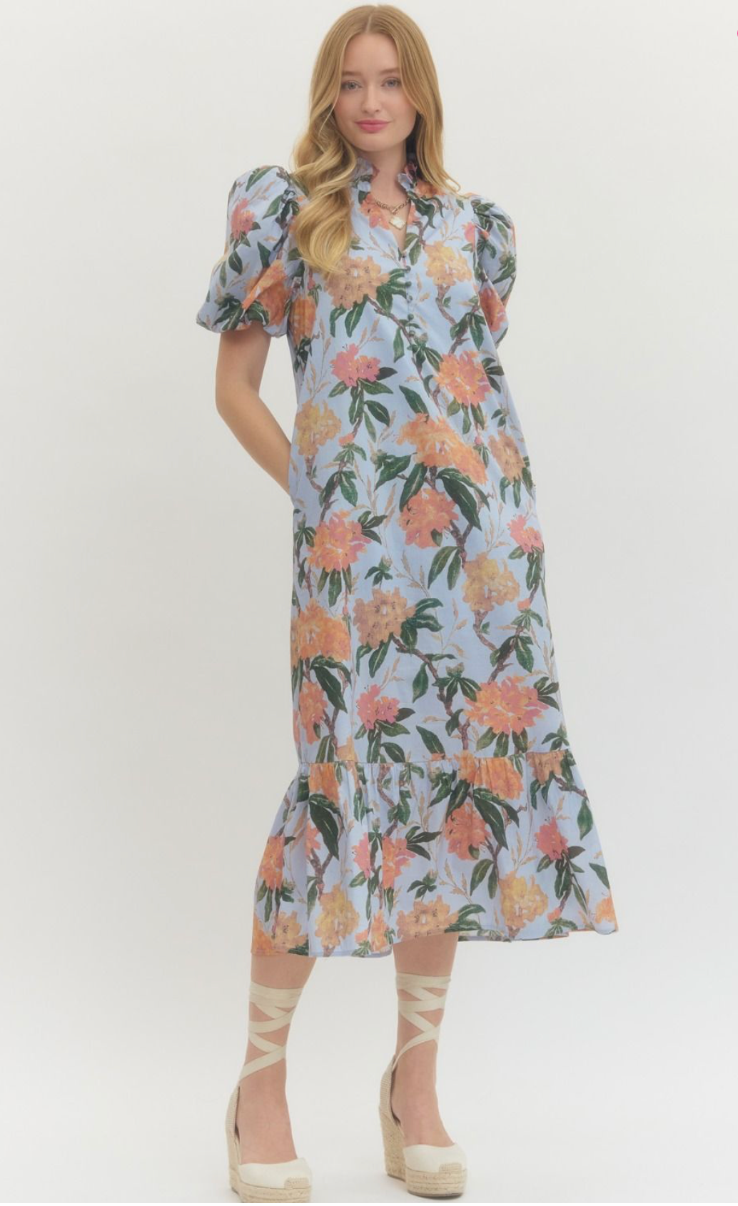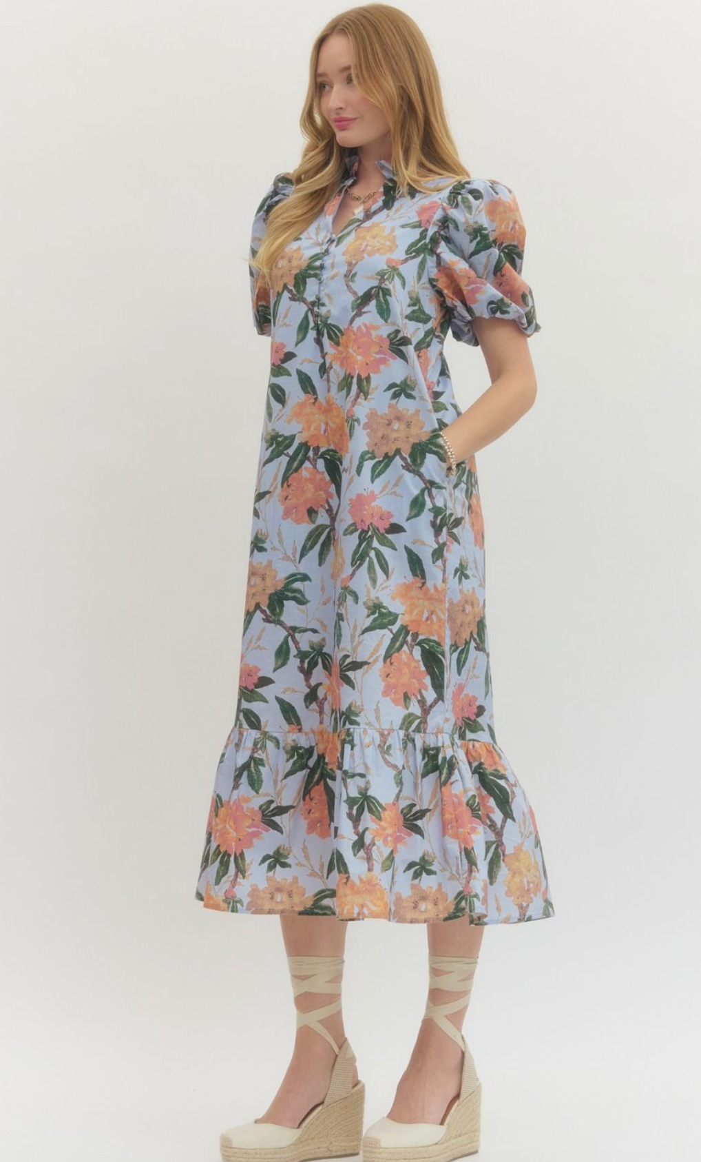 Embrace effortless elegance with the Sweet Meadow Midi Dress, a charming piece that combines romantic style with everyday wearability. The delicate floral print brings natural beauty to your wardrobe, while the ruffled neckline adds a touch of feminine sophistication. Short puff sleeves provide a flattering silhouette that works beautifully across seasons, and the midi length offers versatile styling options for both casual outings and special occasions. The practical button closure ensures a secure, adjustable fit. Perfect for anyone seeking a dress that balances timeless charm with modern comfort.