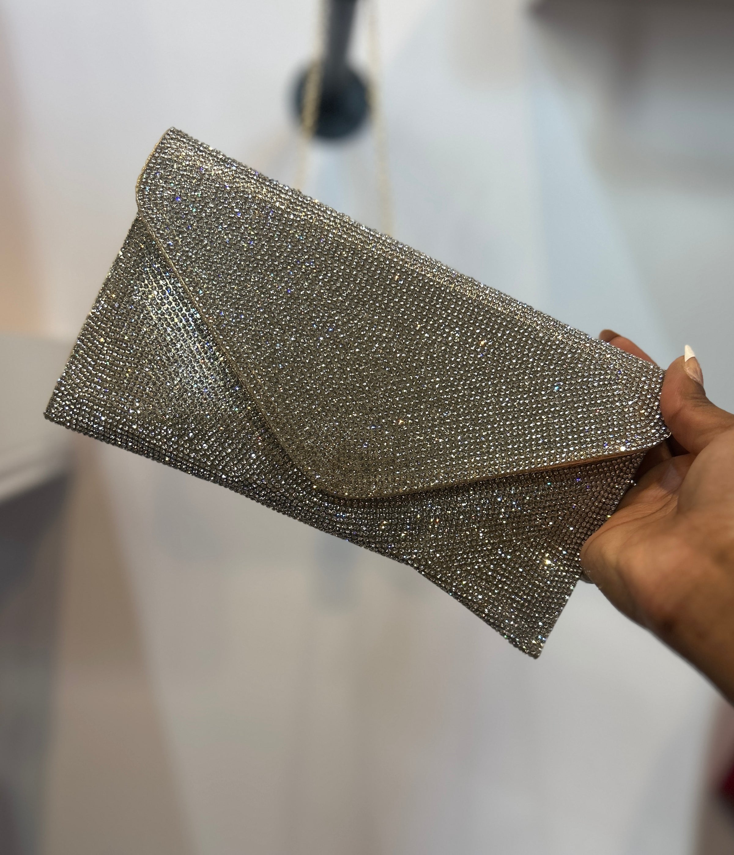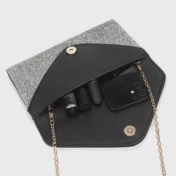 Elevate your evening look with this stunning rhinestone crossbody clutch. Adorned with sparkling crystals that catch the light beautifully, it's the perfect accessory for nights out, special events, or whenever you want to add glamour to your outfit. The convenient crossbody strap keeps your hands free while the compact design fits essentials effortlessly. A hidden interior pocket keeps smaller items organized and secure. Versatile, eye-catching, and undeniably chic—this clutch transforms any ensemble into something truly spectacular.