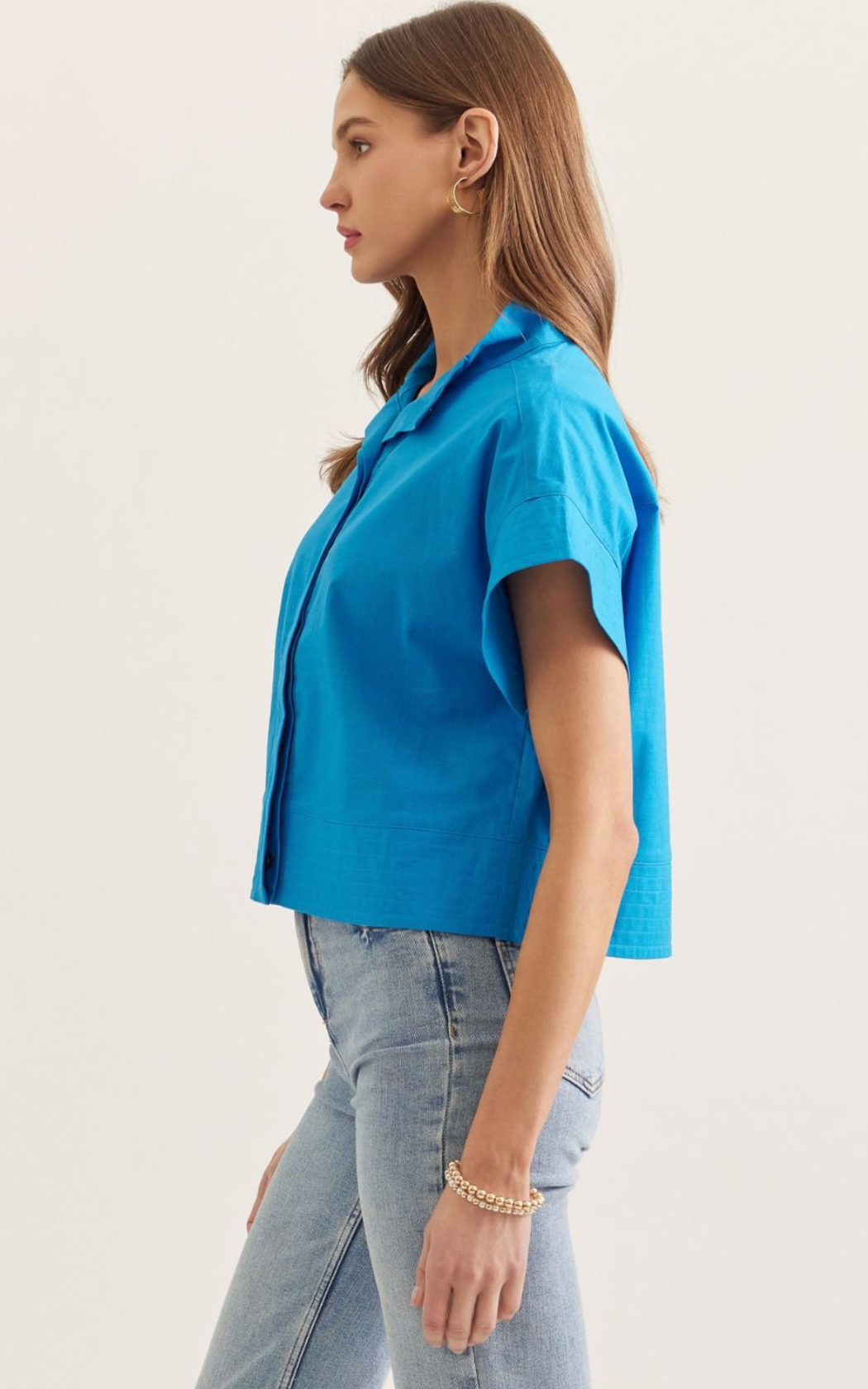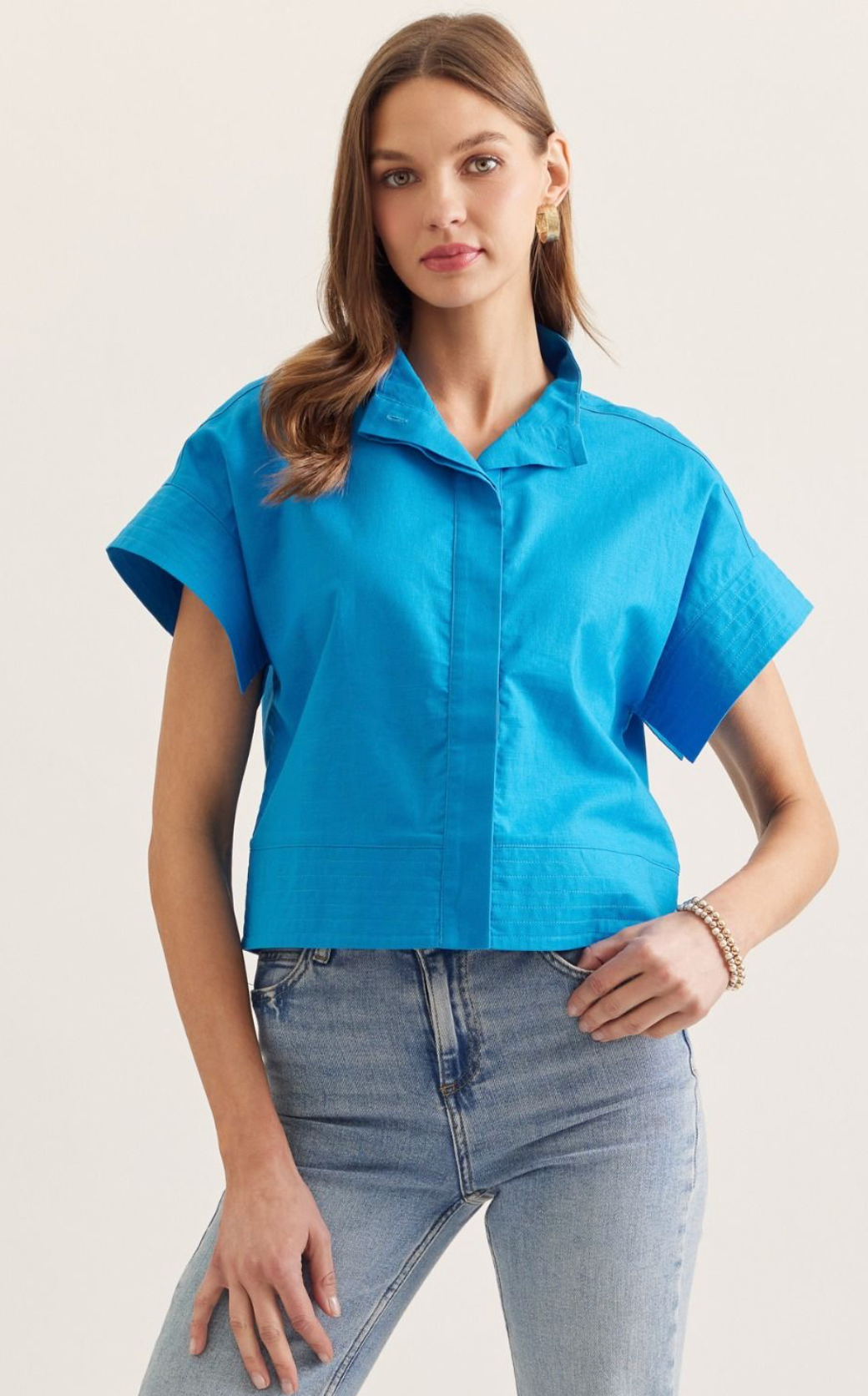 The Azure Edge Top delivers effortless sophistication with its clean stand collar and hidden button front—no fussy details, just streamlined style. Crafted from lightweight woven fabric that moves with you, this unlined piece offers breathable comfort without transparency concerns. Perfect for layering or wearing solo, it's the versatile essential that transitions seamlessly from casual to polished.