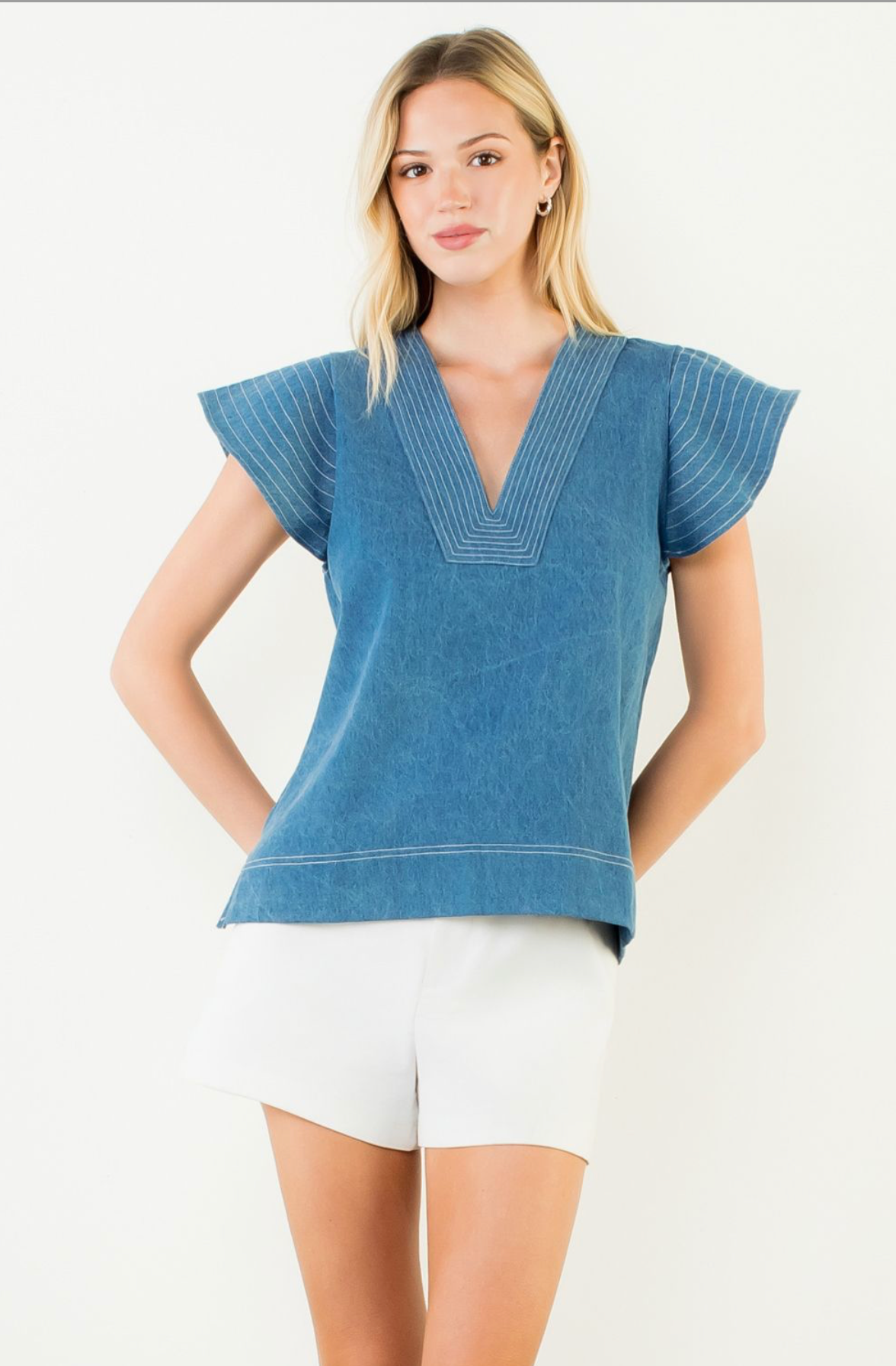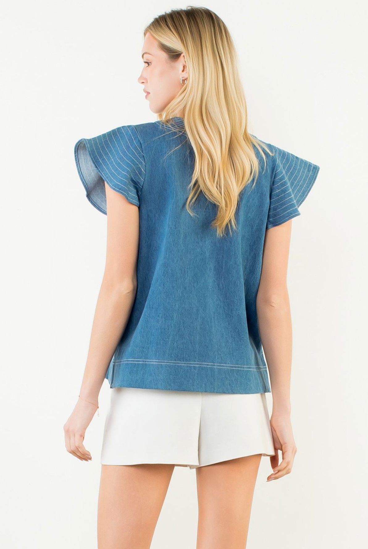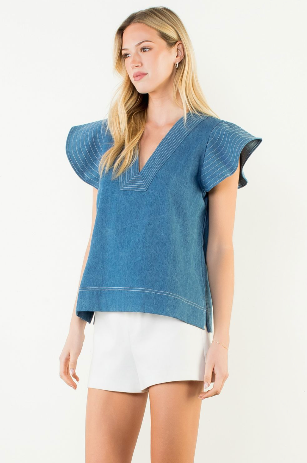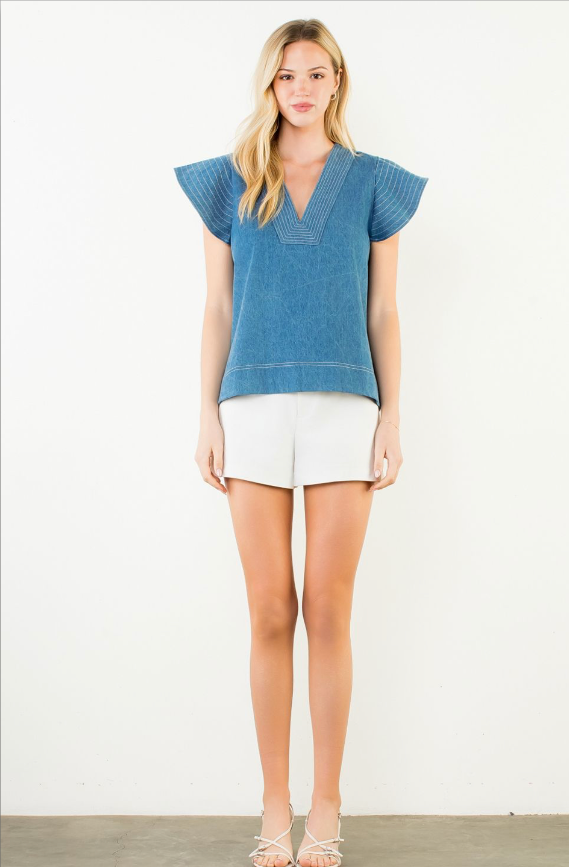 Effortlessly chic and versatile, this denim flutter top combines classic style with modern flair. The flattering V-neckline elongates your silhouette while short flutter sleeves add a playful, feminine touch. Crafted from quality denim, it's the perfect layering piece for any season—dress it up with tailored pants or down with your favorite jeans. A wardrobe essential that transitions seamlessly from casual weekends to polished weekday looks.
