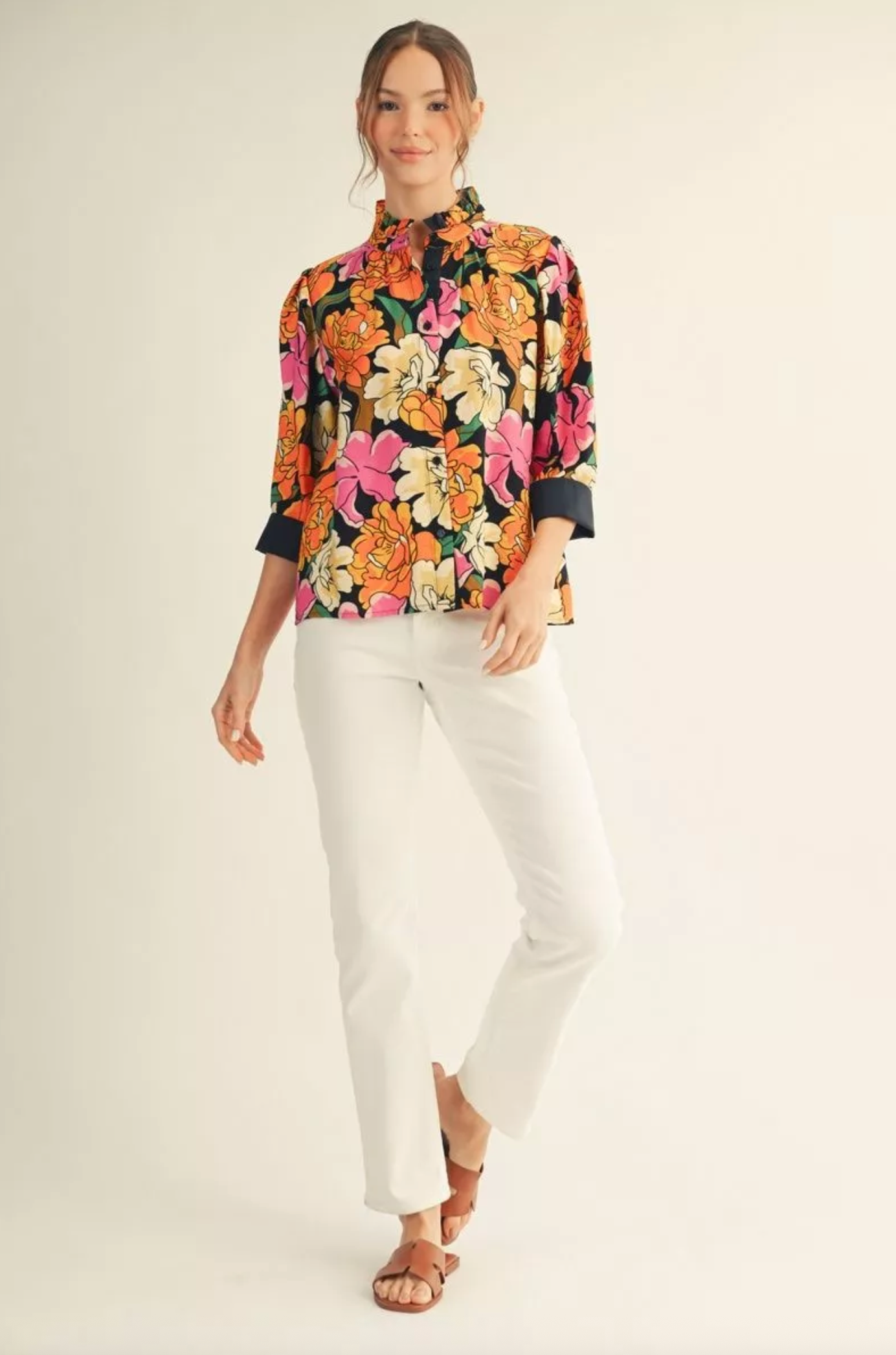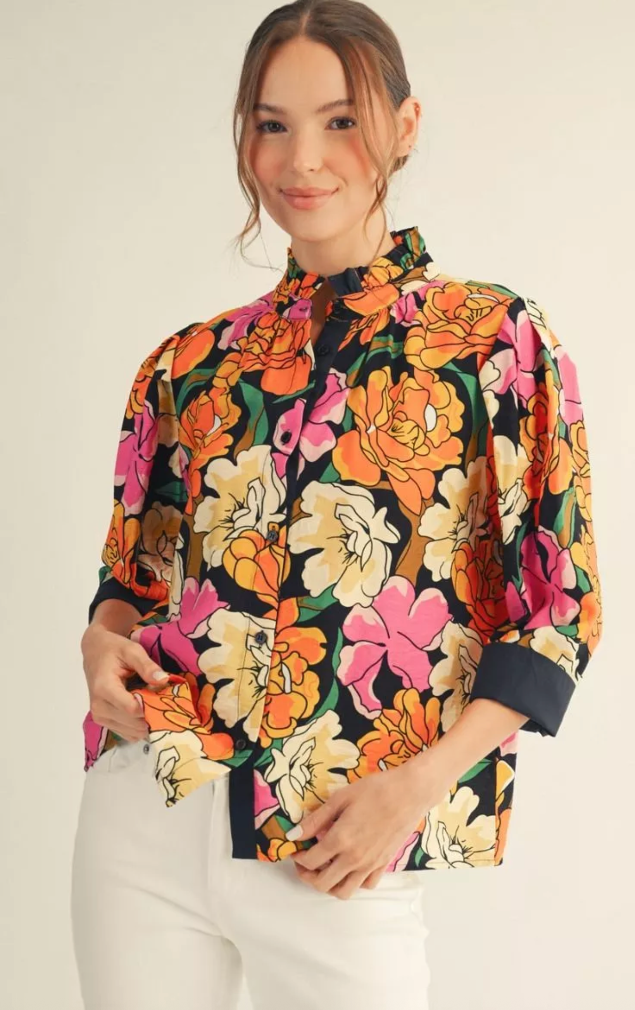 Elevate your wardrobe with the Garden Party Top, a charming piece that effortlessly transitions from casual to polished. This floral button-down features three-quarter sleeves and a delicate ruffled neckline that adds feminine flair, while a solid contrast accent creates visual interest and versatility. Perfect for pairing with jeans, skirts, or trousers, this top brings garden-inspired elegance to any occasion. The thoughtful design details make it a go-to favorite for those who appreciate both style and comfort.
