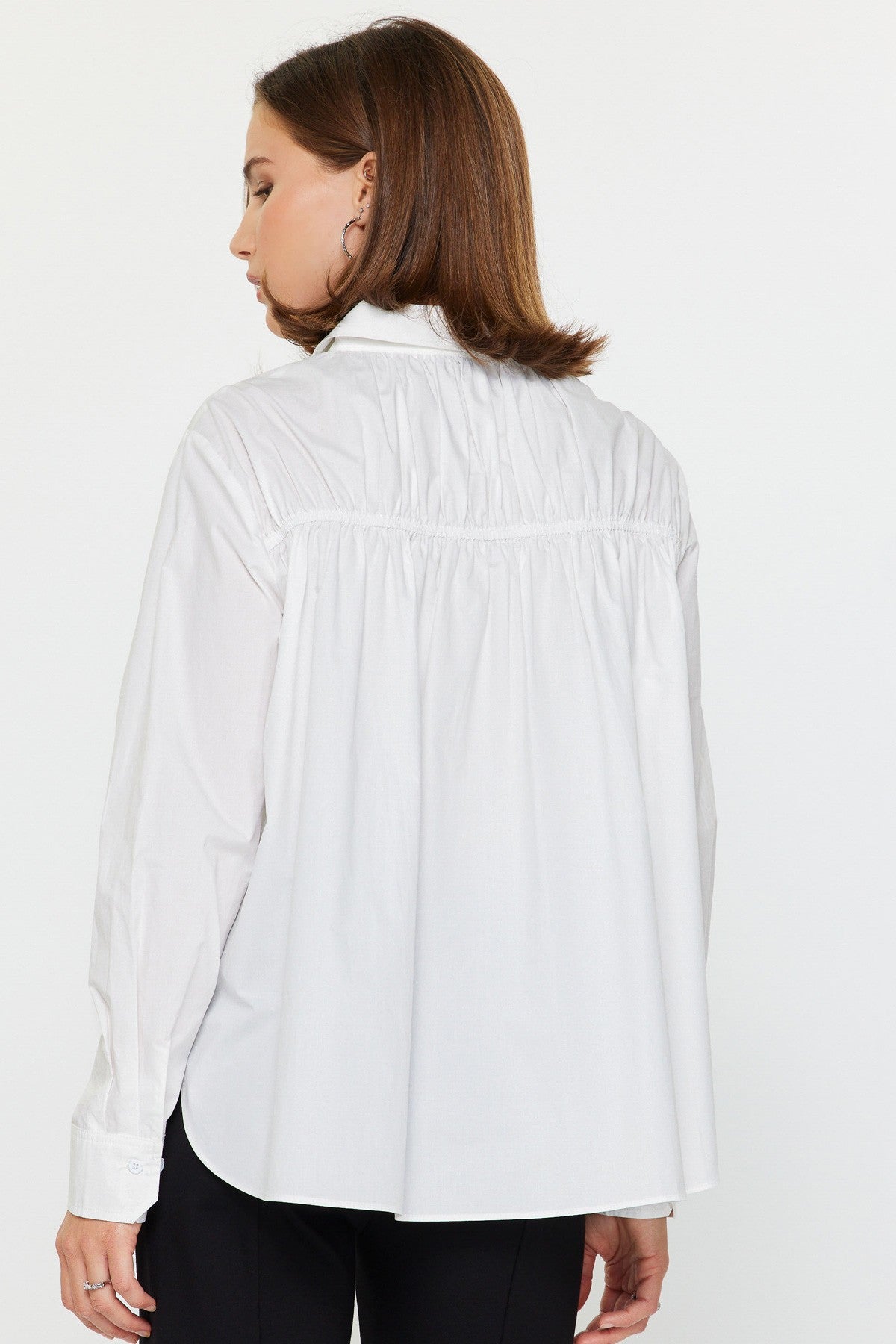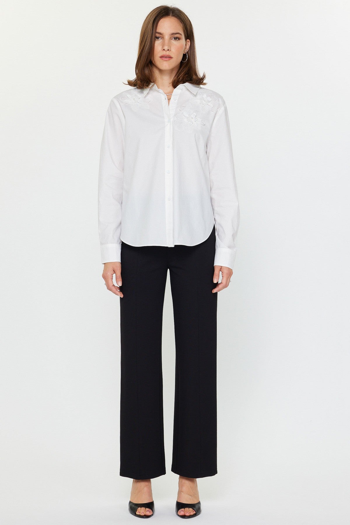 Elevate your everyday wardrobe with the Ivory Blossom Button-Down, a sophisticated piece that seamlessly blends timeless elegance with modern design. The striking 3D floral appliqué adds dimensional texture and visual interest, while strategic back shirring creates a flattering silhouette that moves with you. Classic details like the crisp shirt collar, front button closure, and button cuff sleeves deliver polished versatility—dress it up for the office or down for weekend sophistication.