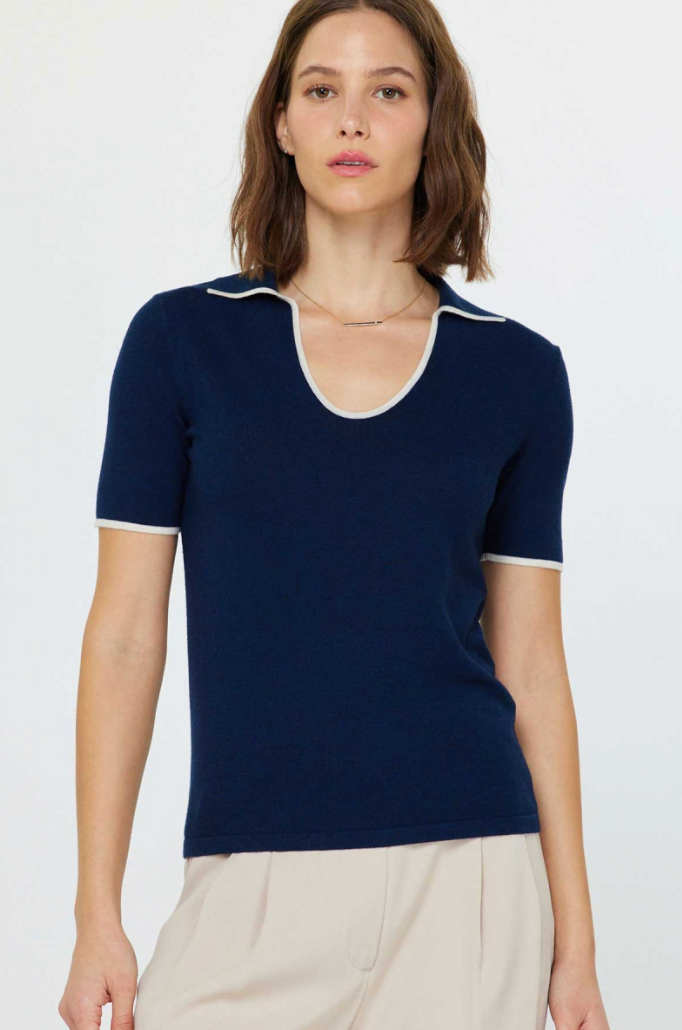 The Nautical Edge Top brings effortless sophistication to your everyday wardrobe. This short-sleeve U-neck polo sweater combines classic styling with modern comfort, making it perfect for layering or wearing solo. The relaxed fit flatters all body types while the breathable fabric keeps you cool throughout the day. Whether you're dressing up for the office or down for casual outings, this versatile piece transitions seamlessly from season to season. Elevate your basics with a timeless essential that works as hard as you do.