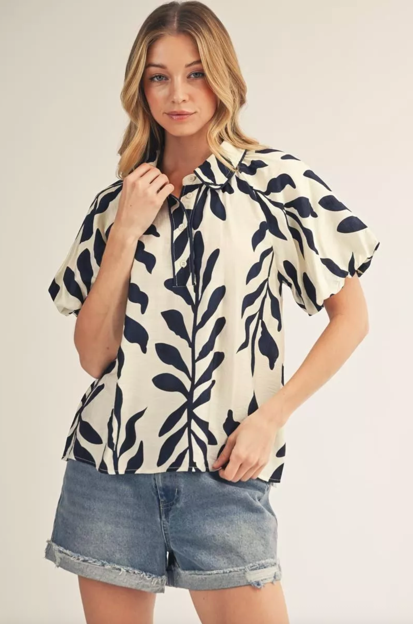Elevate your everyday wardrobe with this charming Navy Leaf Top, featuring delicate leaf-print detailing that brings natural elegance to any outfit. The front button-up design offers effortless styling versatility, while the short bubble sleeves add a playful, feminine touch that flatters every frame. Perfect for layering or wearing solo, this piece transitions seamlessly from casual weekends to polished workdays. Comfortable, chic, and endlessly wearable—a wardrobe essential you'll reach for again and again.