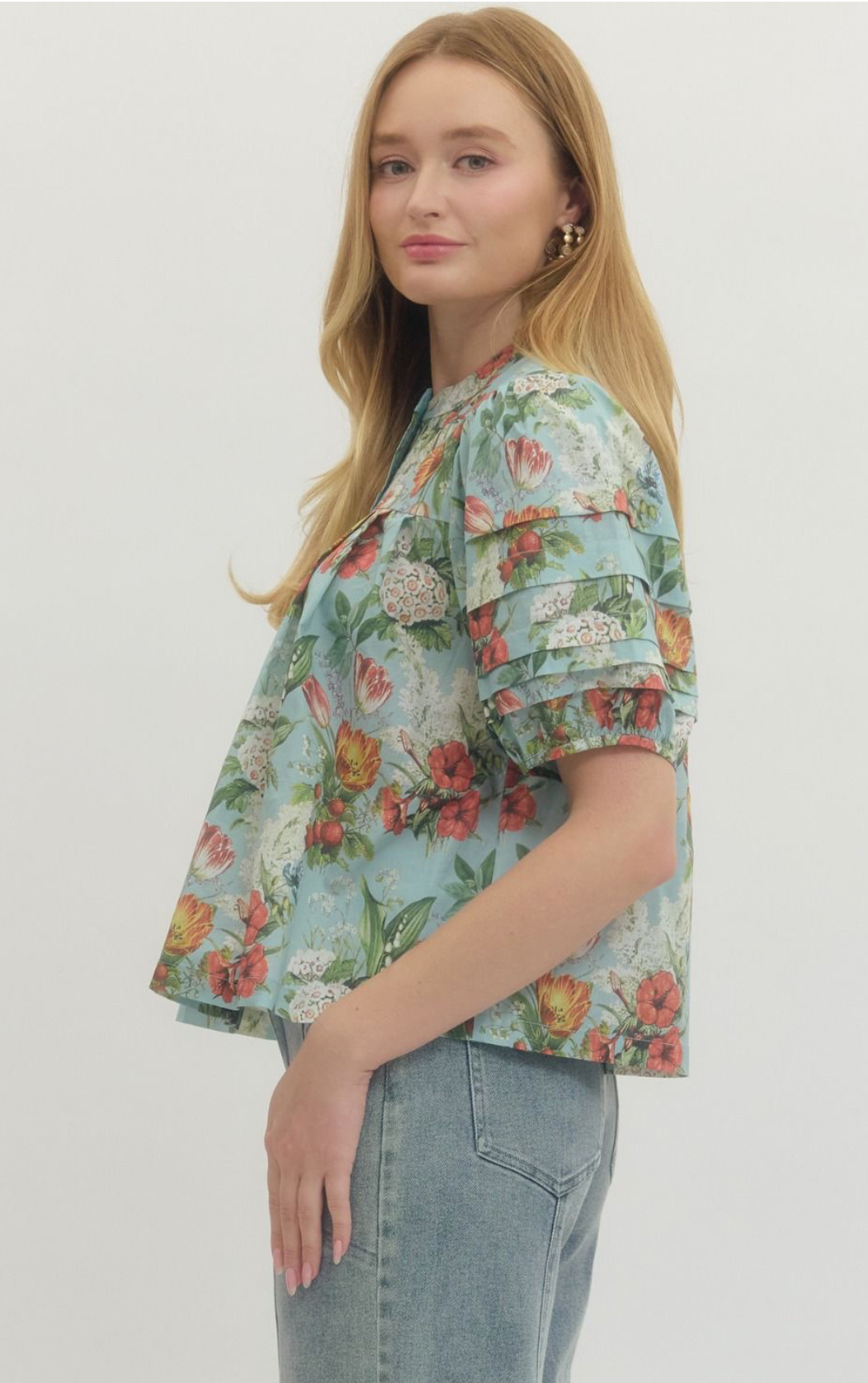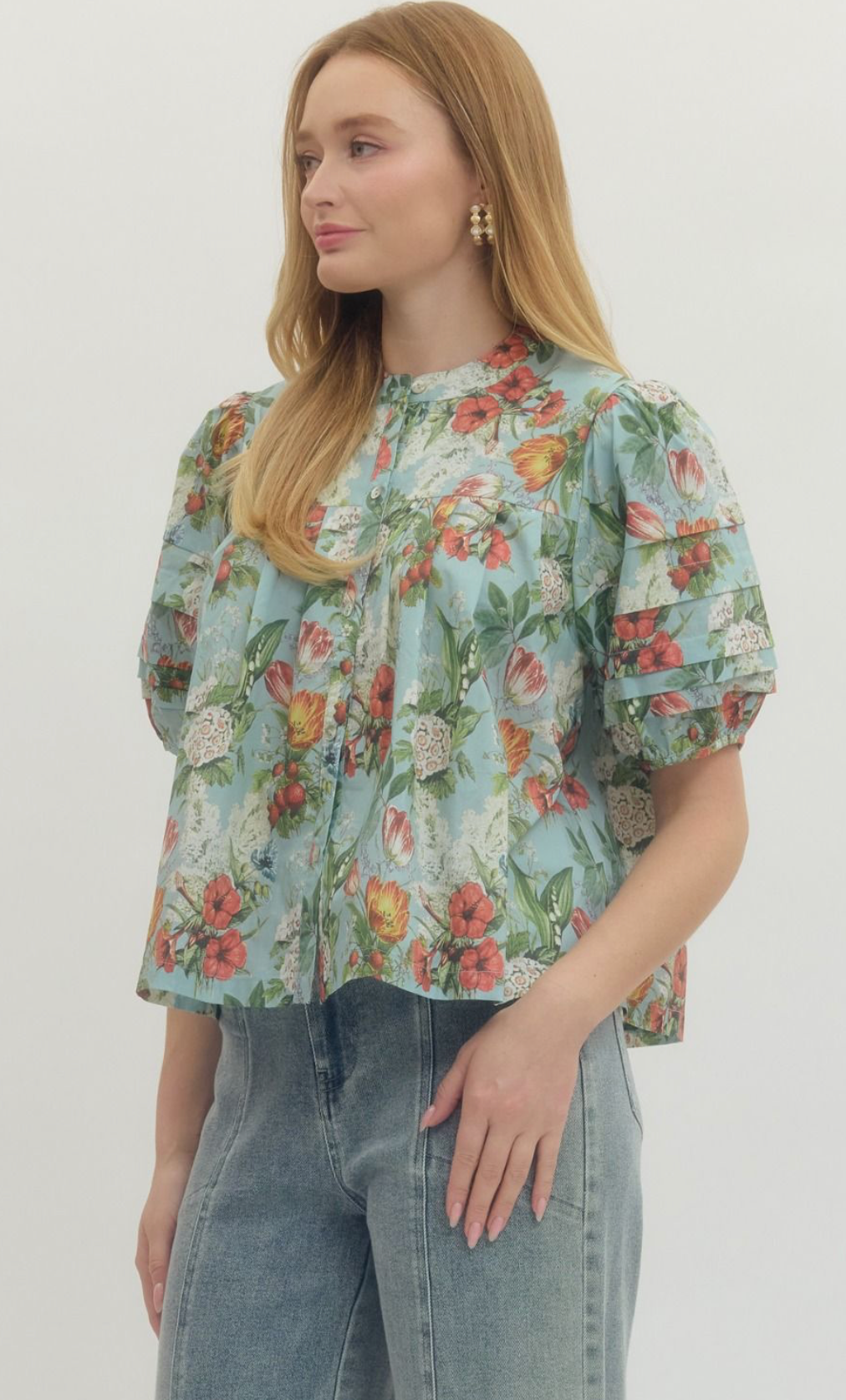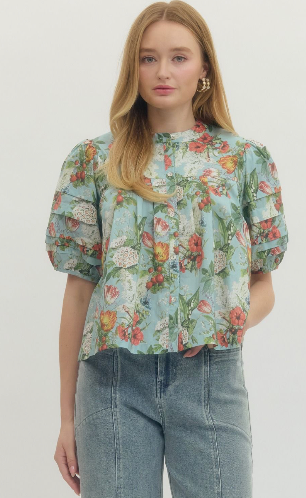 Discover effortless elegance with the Bluebell Garden Top, where romantic florals meet modern design. This lightweight woven piece features charming pleated details at the front and layered accents on the puff sleeves, creating dimension and visual interest. The non-sheer fabric offers comfortable coverage, while the front button closure makes dressing simple. Perfect for layering or wearing solo, this unlined top transitions seamlessly from casual days to weekend outings. Embrace a fresh, feminine look that feels as good as it looks.