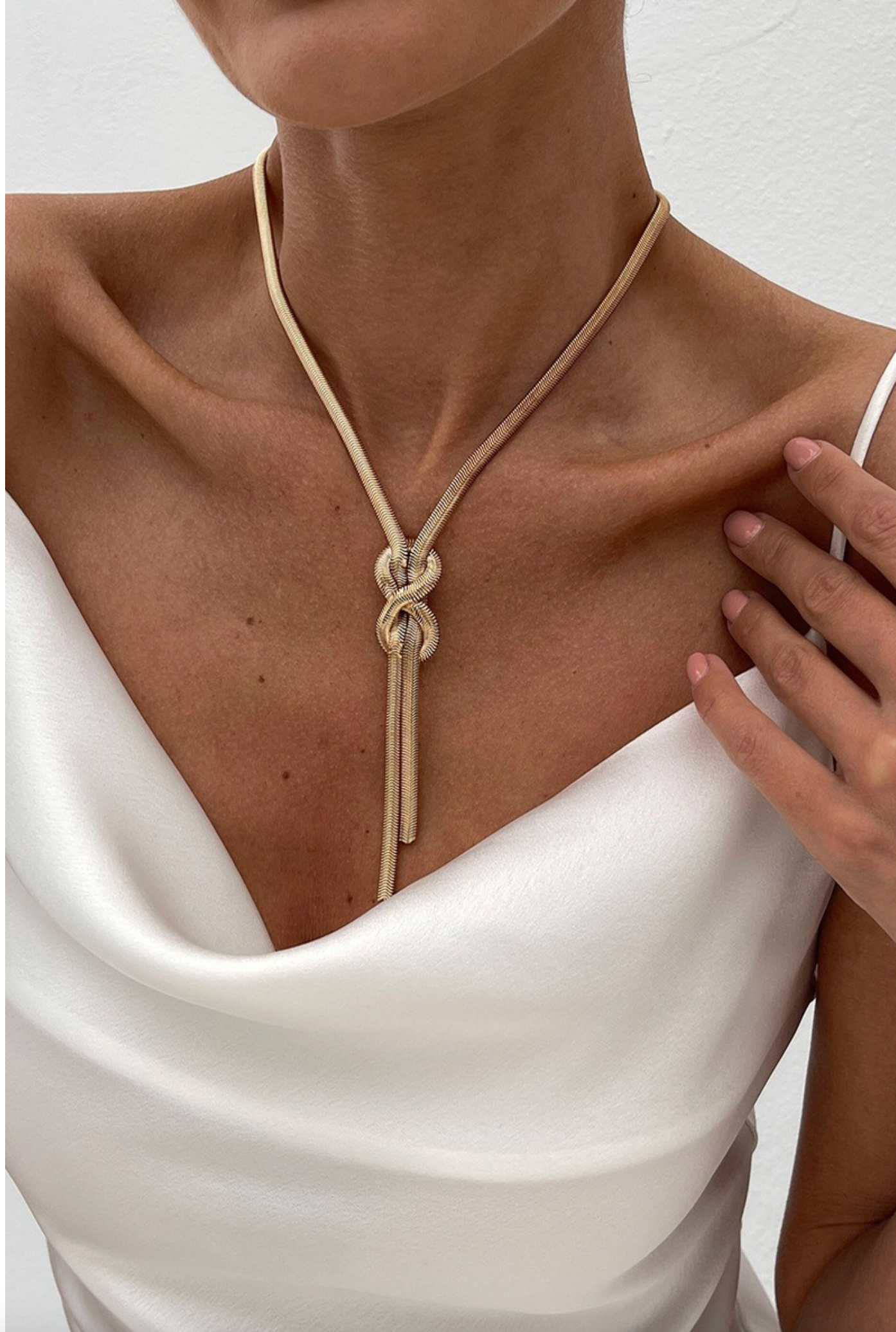 Elevate your everyday style with this sophisticated rope necklace, where timeless elegance meets modern minimalism. Crafted in lustrous gold, the delicate knotted design and flattering Y-shaped silhouette create an effortlessly chic choker that transitions seamlessly from day to night. Perfect as a standalone statement piece or layered with other favorites, this versatile necklace adds refined polish to any outfit. Whether you're dressing up for a special occasion or elevating your casual look, this luxe accessory delivers understated sophistication that speaks volumes about your impeccable taste.