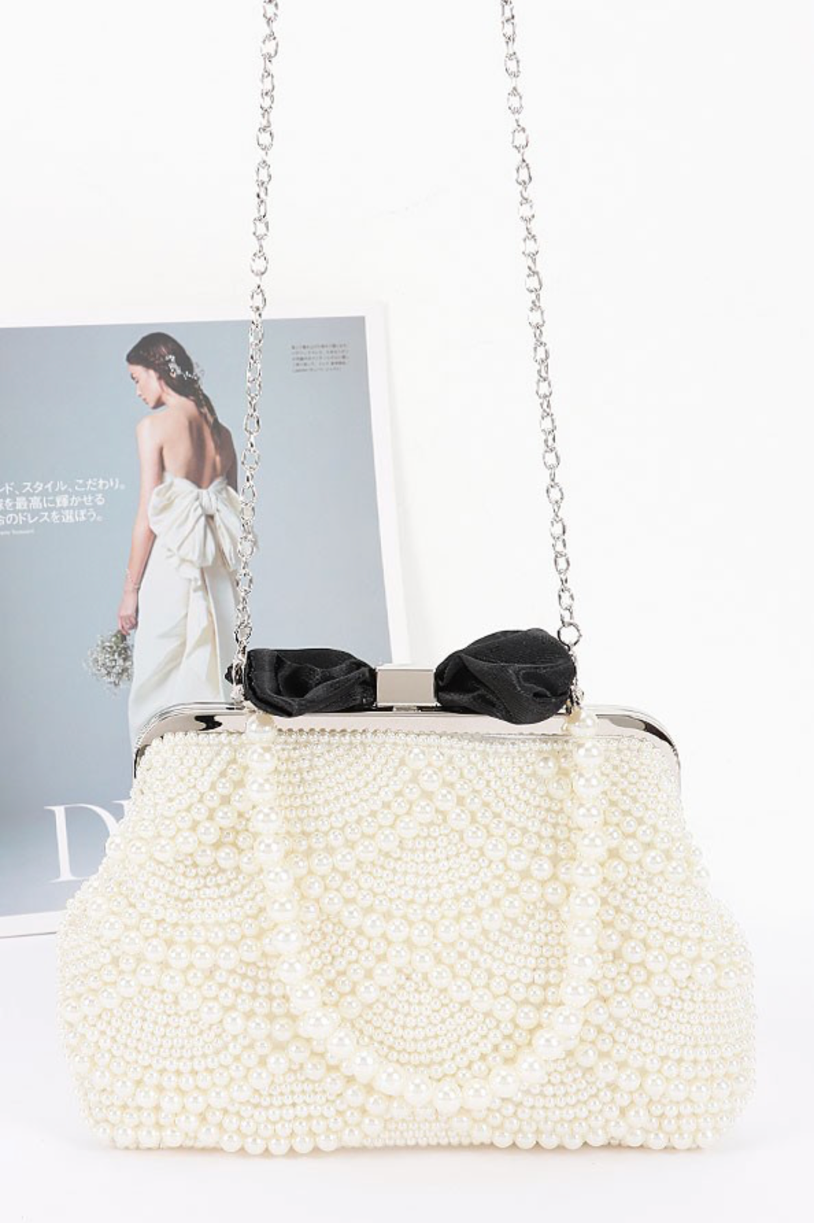 Elevate your evening look with the Pearl Affair Clutch, a stunning accessory that commands attention. Adorned with lustrous faux pearls and anchored by a refined metallic frame, this clutch exudes timeless elegance. The dramatic black satin bows create a captivating contrast against the pearl detailing, making it the perfect finishing touch for cocktail parties, galas, or any special occasion. Compact yet sophisticated, it's designed for those who refuse to compromise on style.