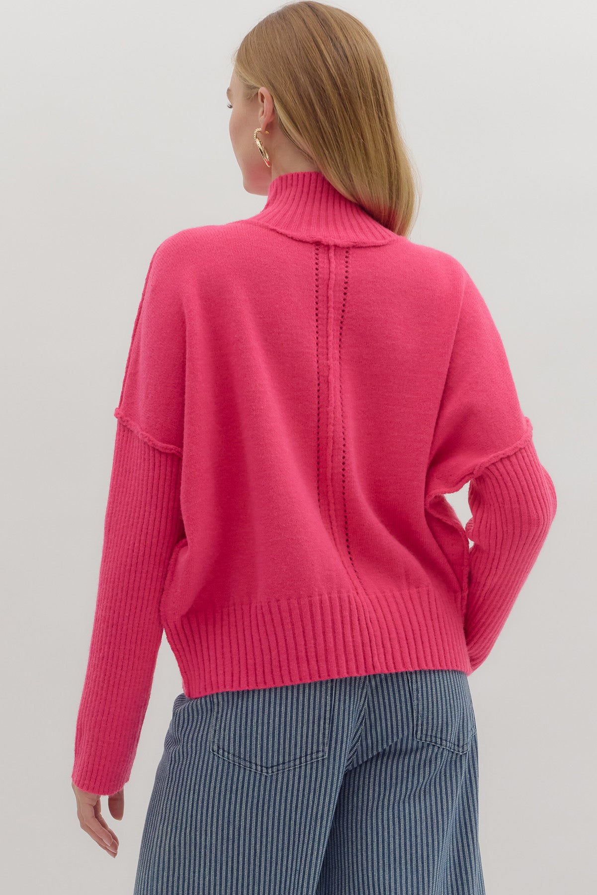 Make a vibrant statement with the Pink Aura Sweater, crafted in a bright fuchsia knit that elevates any outfit. Its relaxed, slightly oversized fit offers comfort without sacrificing style, while the cozy mock neck and ribbed hem and cuffs add refined detail. Perfect for pairing with denim for a casual, colorful look or dressing up with a skirt to impress, this sweater effortlessly combines boldness and chic versatility for year-round wear.
