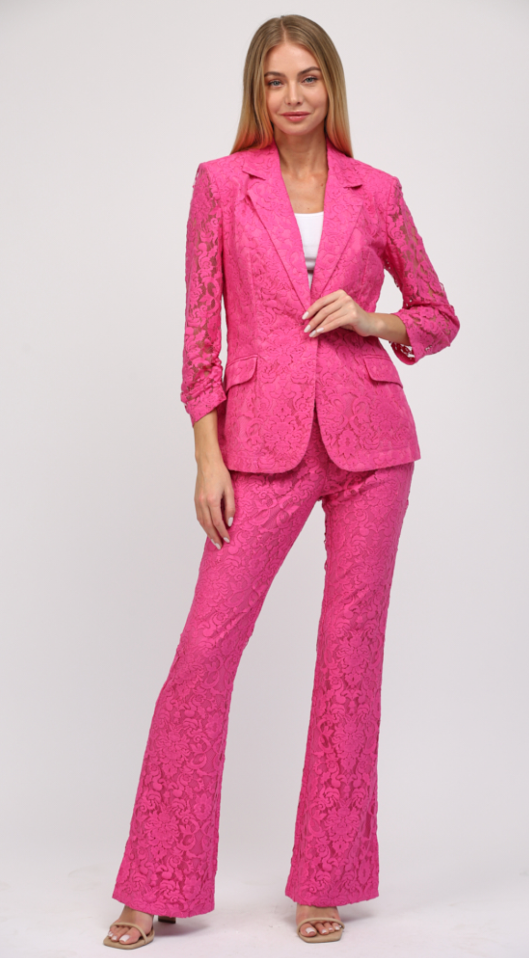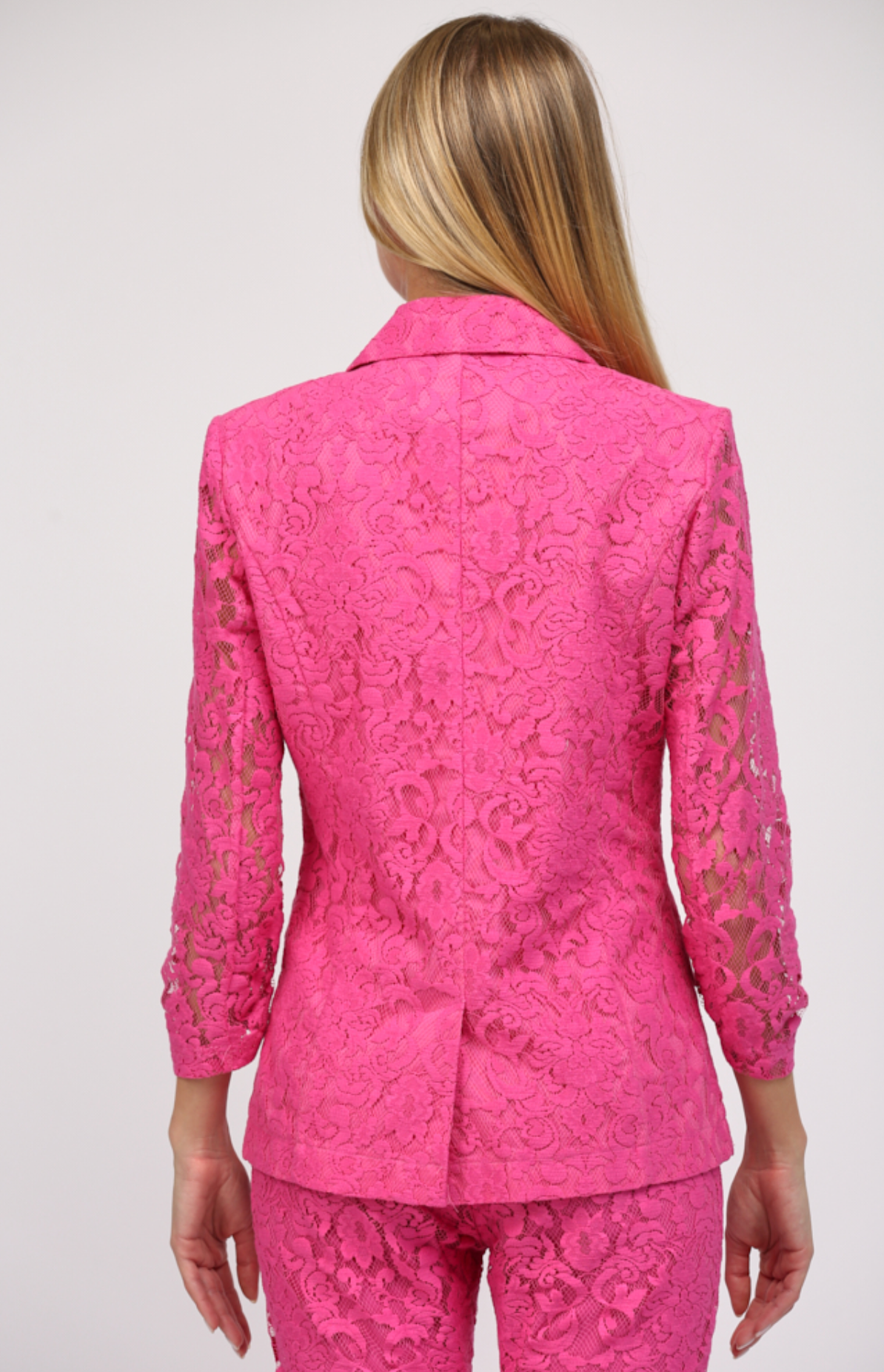 Make an entrance in hot pink. This lace blazer combines bold color with refined elegance—delicate lace detailing catches light while the structured fit commands attention. Wear it solo for maximum impact or layer over basics for everyday sophistication. The sheer lace elements add texture and movement, making this piece work from boardroom to cocktail hour. Style with minimalist accessories to let the blazer be your statement.
