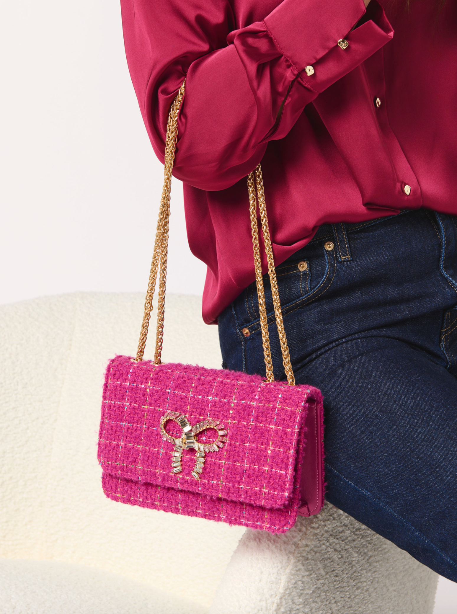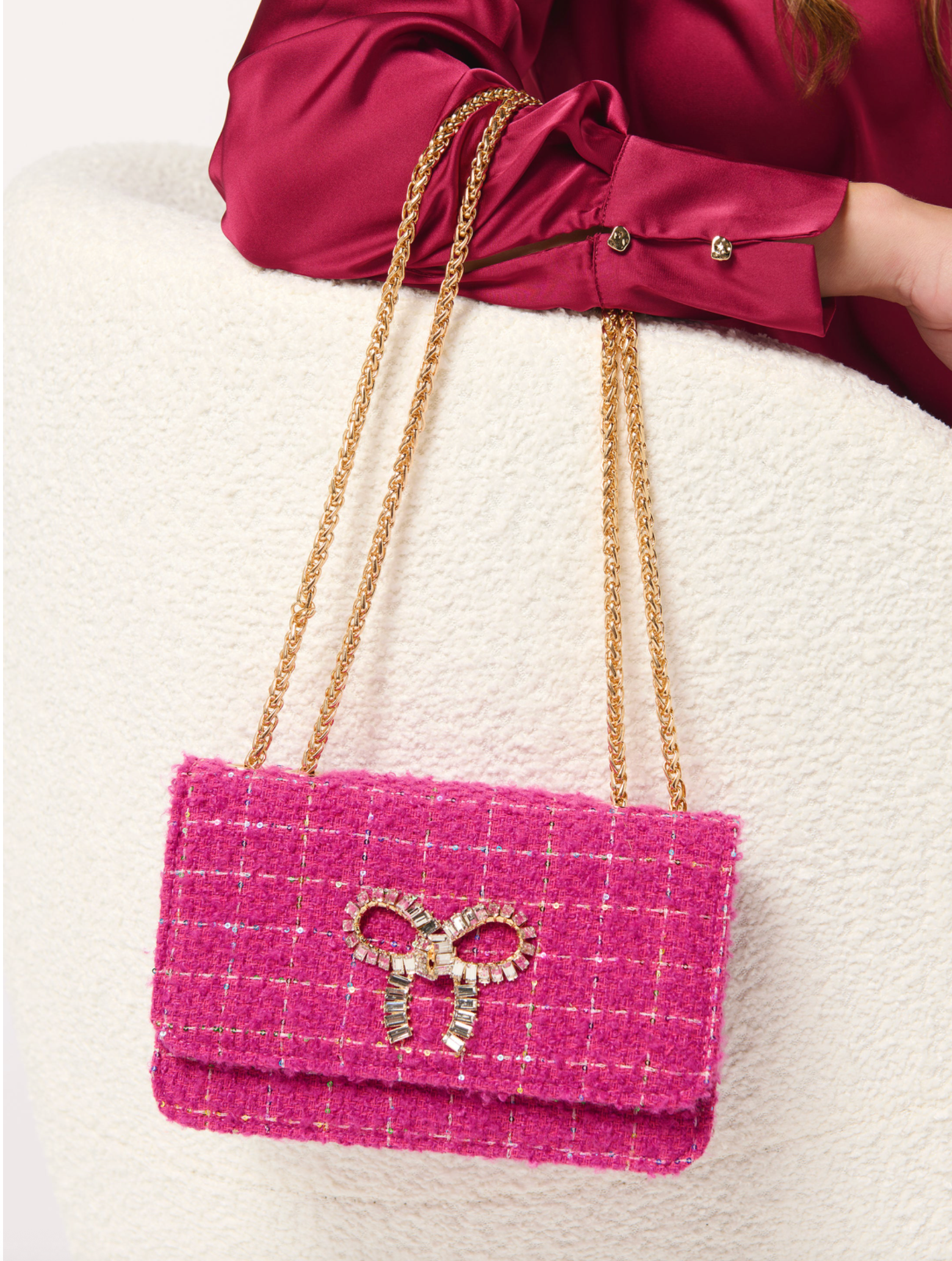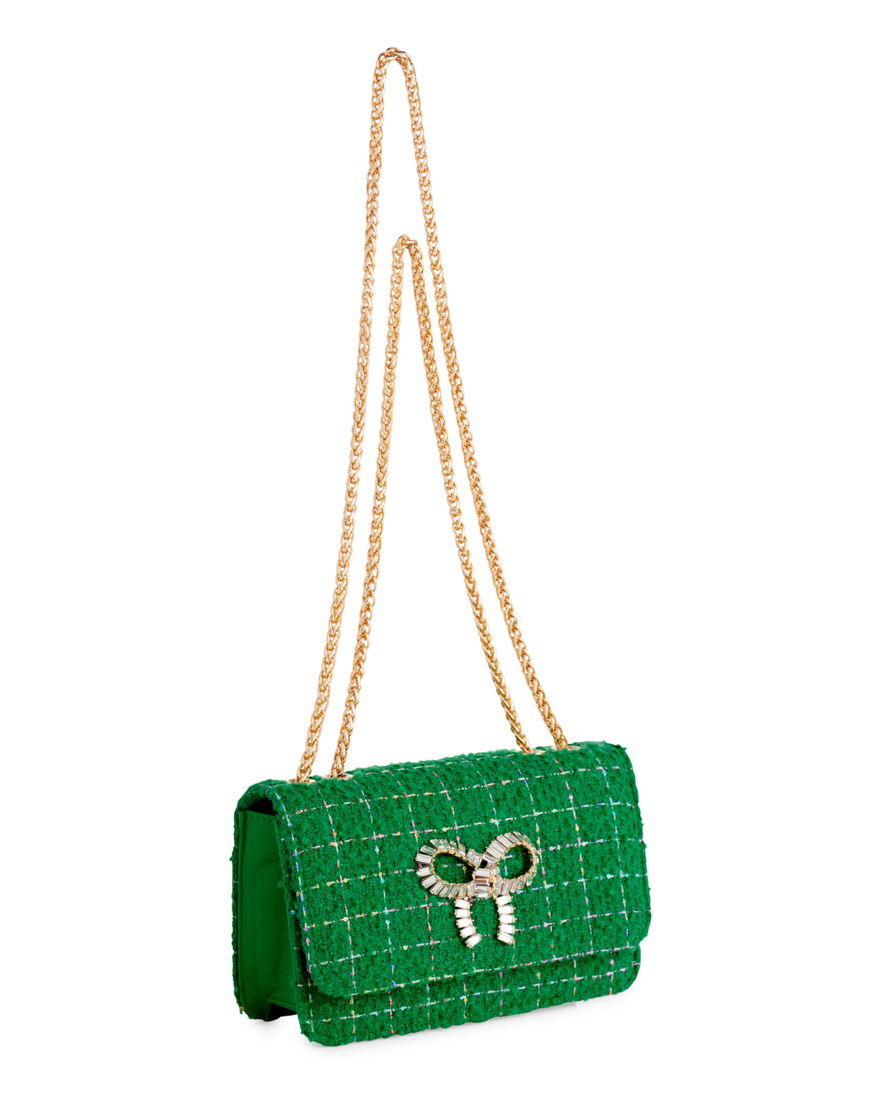 Make a statement with the Roa Shoulder Bag—a chic, structured piece that brings a pop of texture and sparkle to any outfit. Crafted from luxe tweed fabric, this bag features double gold chain shoulder straps, a secure snap closure, and an interior slip pocket for your essentials. Perfect for holiday parties or brunch dates, Roa delivers an elevated touch of fun that works beautifully with both glam and casual looks. Choose from festive shades designed to complement any style.