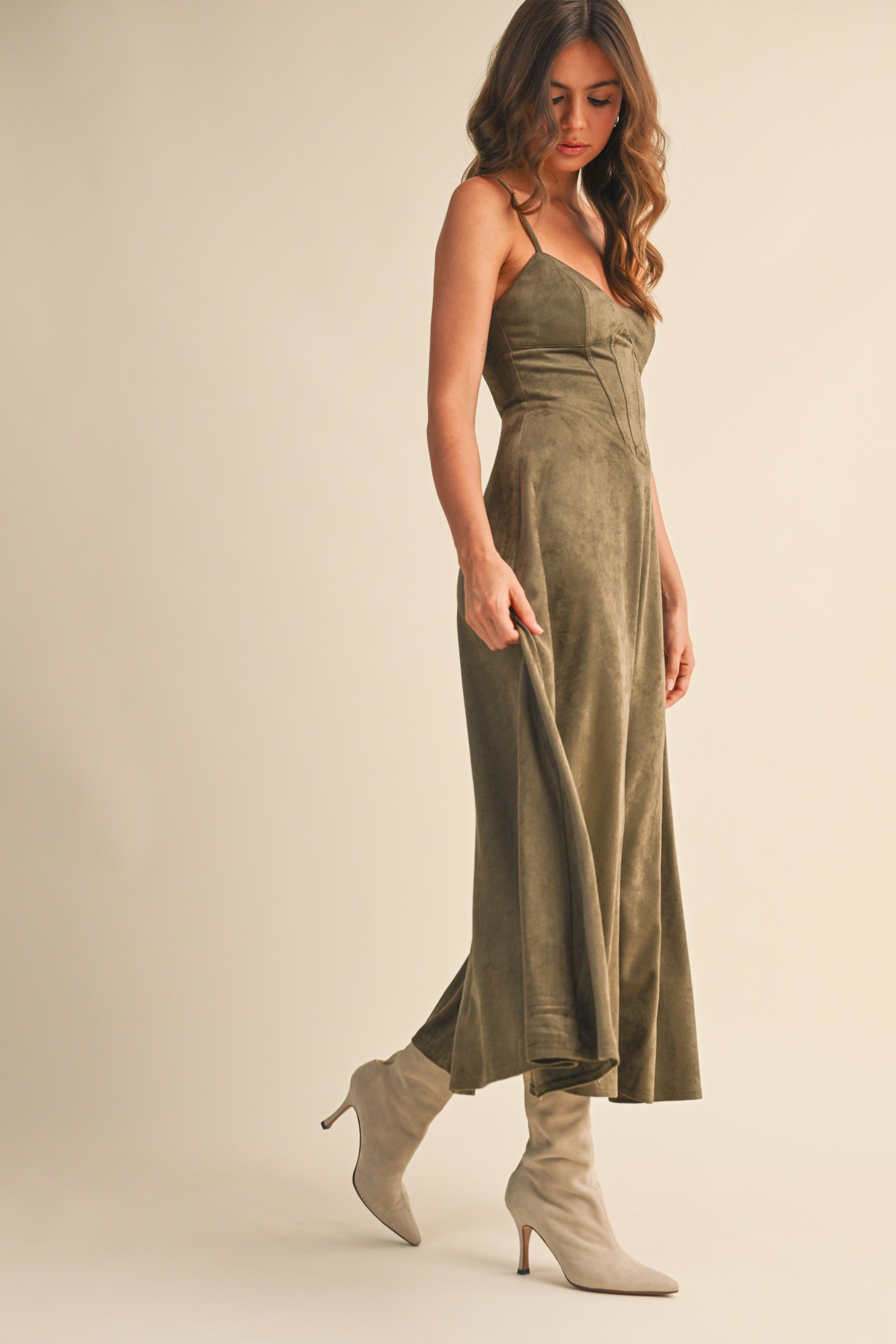Elevate your evening look with this stunning suede bustier corset dress. Crafted from lightweight suede, it features a flattering flared midi silhouette that moves beautifully with you. Adjustable straps let you customize the fit to perfection, while the elastic back provides gentle stretch and comfort all night long. Whether you're heading to a special event or a night out, this dress delivers sophisticated allure with effortless wearability.
