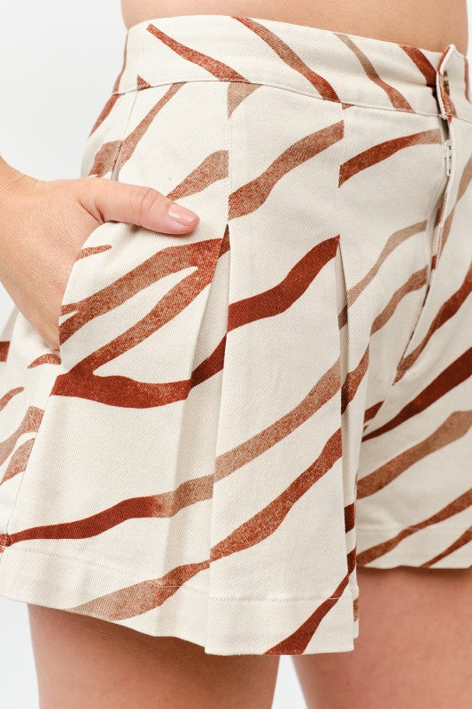 Zebra Muse Shorts combine bold style with everyday practicality. These striking shorts feature a distinctive zebra print that commands attention, while functional details keep you comfortable and organized. Pleated detailing adds dimension and movement, side pockets offer convenient storage, and a secure zip fly with button closure ensures a perfect fit. Whether you're heading out for an adventure or making a statement around town, these shorts deliver confidence and versatility in one eye-catching package.